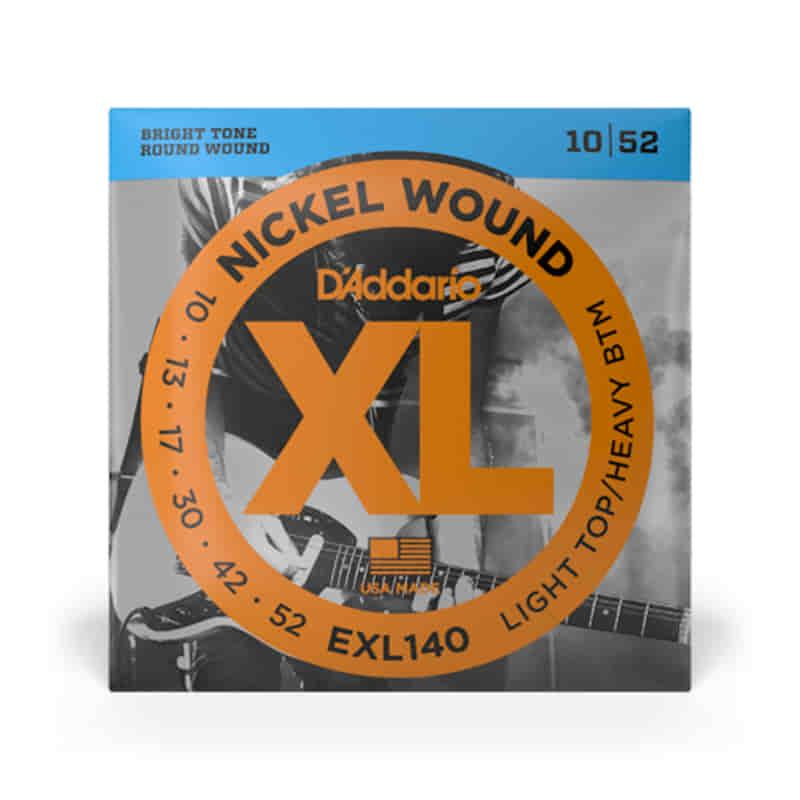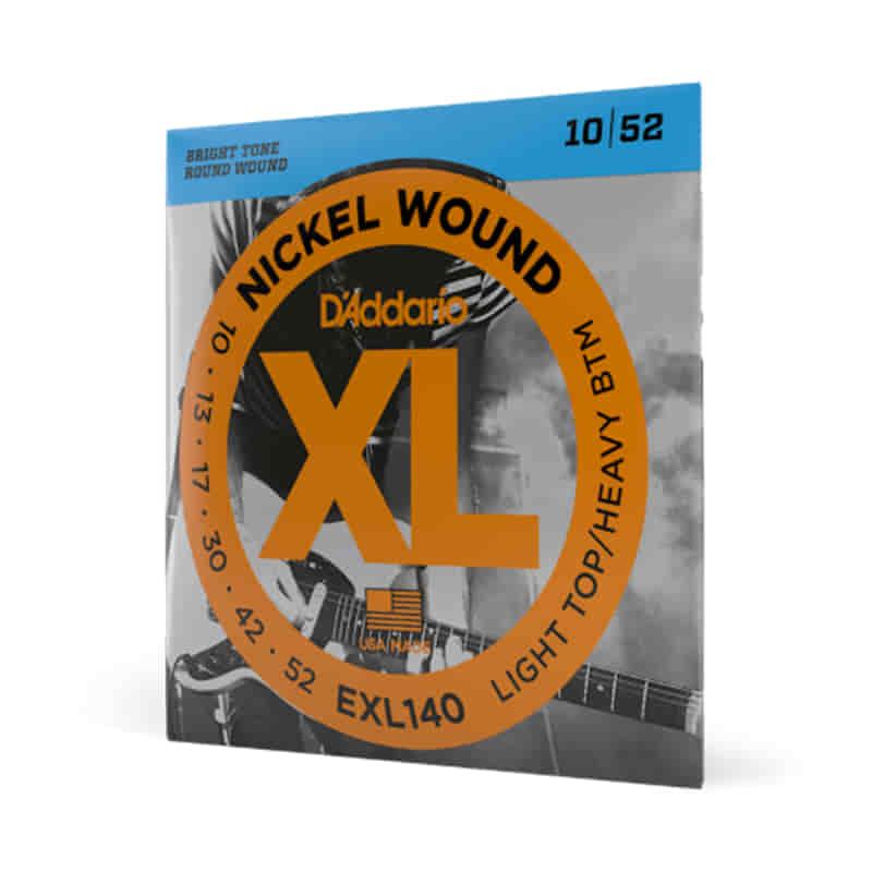 EXL140 is one of D'Addario's most popular hybrid sets. It combines the high strings of an EXL110 (.010) with heavier low strings (.052). This combination offers powerful lows for heavy chords and flexible plain steel strings for great bends.