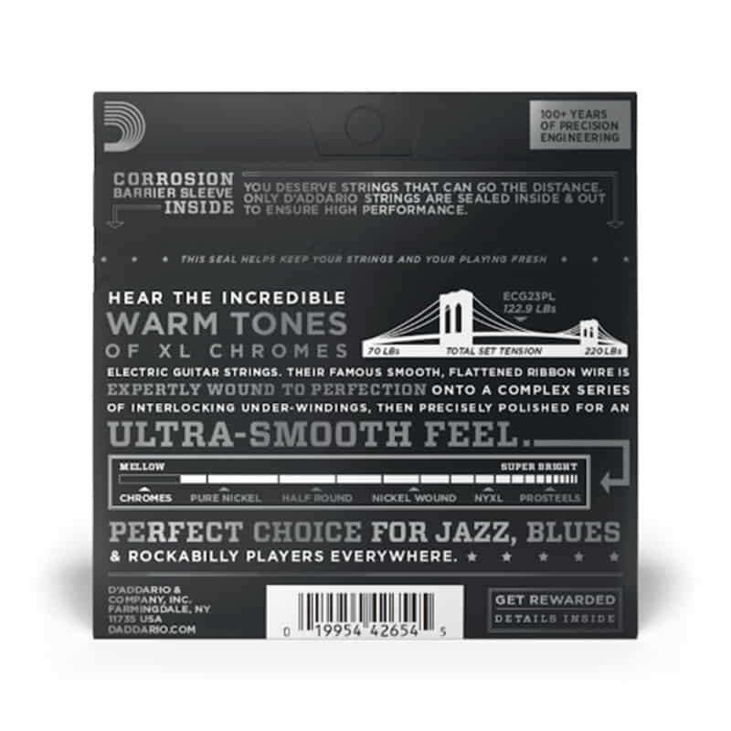 - Der Flachdraht aus Edelstahl, mit dem die Chromes umsponnen sind, wird präzise poliert für eine unvergleichlich glatte Oberfläche und den wärmsten Ton, den man bei einer E-Gitarrensaite überhaupt findet.