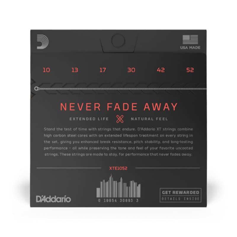 D'Addario XT nickel-plated steel electric guitar strings are made from the popular electric guitar alloy and have been specially treated for a longer lifespan, all while maintaining the natural tone and feel of uncoated strings. Available for 6-string electric guitars in gauges from extra light to light top/heavy bottom, suitable for different playing styles and preferences.