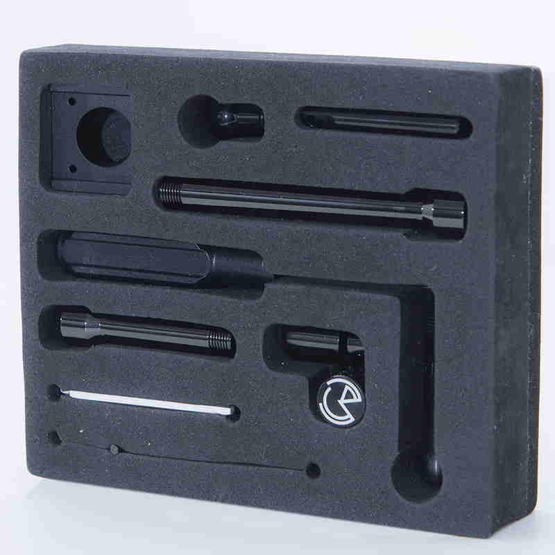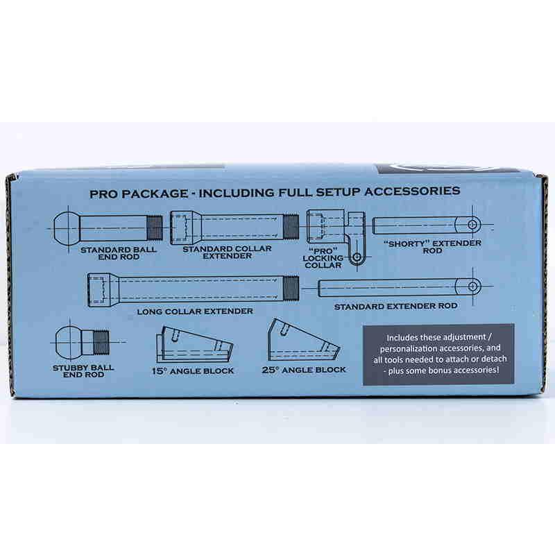 Pro-Paket Inhalt: Wiegestelle, Beinstütze, "Pro" Feststellring, Standard- & lange Ringverlängerung, Standard- & "Shorty"-Verlängerungsstäbe, Standard- & Stubby-Kugelstäbe, 15° & 25° Winkelblöcke, inklusive aller Montagewerkzeuge.